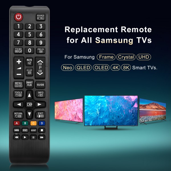 - 【Applicable Model】 Universal Remote Control for Samsung TV is compatible with all Samsung LED, LCD, HDTV, QLED, SUHD, UHD, 4K, 3D Serie Smart TVs.It can be a replacement remote for Samsung tv remote like BN59-01266A, BN59-01312A, BN59-01312G, BN59-01310A, BN59-01259E, BN59-01330A, BN59-01329A, BN59-01298A, BN59-01298H, BN59-01292A, BN59-01241A, BN59-01293A, BN59-01357A, BN59-01199F, BN59-01301A, BN59-01289A AA59-00784C BN59-01315A BN59-01315J BN59-01385A BN59-01439A BN59-01432A BN59-01386A BN59-01247A BN59-01175N etc.
